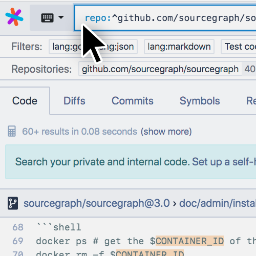 In-repository code search is now available in Sourcegraph. Simply click the magnifying glass icon above the file tree, type your search term, and click enter. Once you select a result, you’ll get full code intelligence, including our info panel whenever you click a method, variable or struct. In…