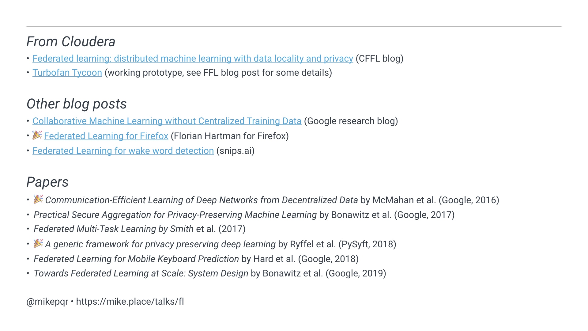 This talk will explain the ideas around training models on different nodes in more detail. I'll describe a specific instance of a federated learning algorithm (called federated averaging), and I'll explain the ways in which the real world full of malicious actors and distributed systems complicates the naive picture. I'll then talk about the research that is going on right now to harden security, reduce communication costs, and strengthen privacy guarantees.